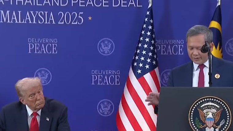 ملائیشیا میں کمبوڈیا اور تھائی لینڈ کے درمیان امن معاہدے پر دستخط کے موقع پر بات کرتے ہوئے امریکی صدر کا کہنا تھا کہ آپ جانتے ہی ہیں کہ کمبوڈیا اور تھائی لینڈ کی جنگ ان آٹھ جنگوں میں سے ایک ہے جو میری انتظامیہ نے گزشتہ آٹھ ماہ میں ختم کروائی ہے، یہ اوسطاً ہر ماہ ایک جنگ بند کروانے کے برابر ہے، اب صرف ایک ہی باقی ہے۔